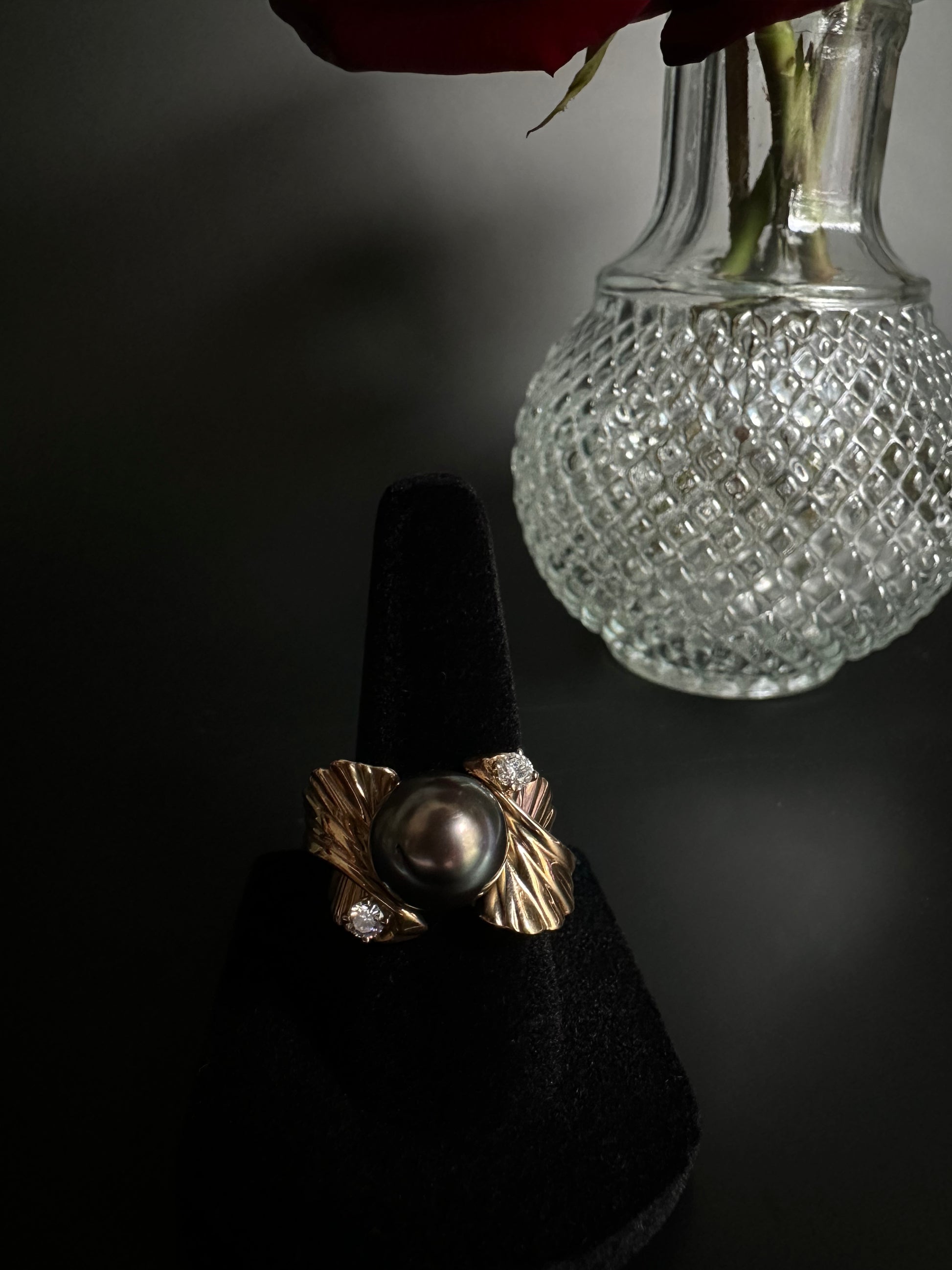 Black South Sea pearl (10mm) in 14kt yellow gold shell like setting with two diamonds set diagonally (diamonds are .21ctw), size 6.5