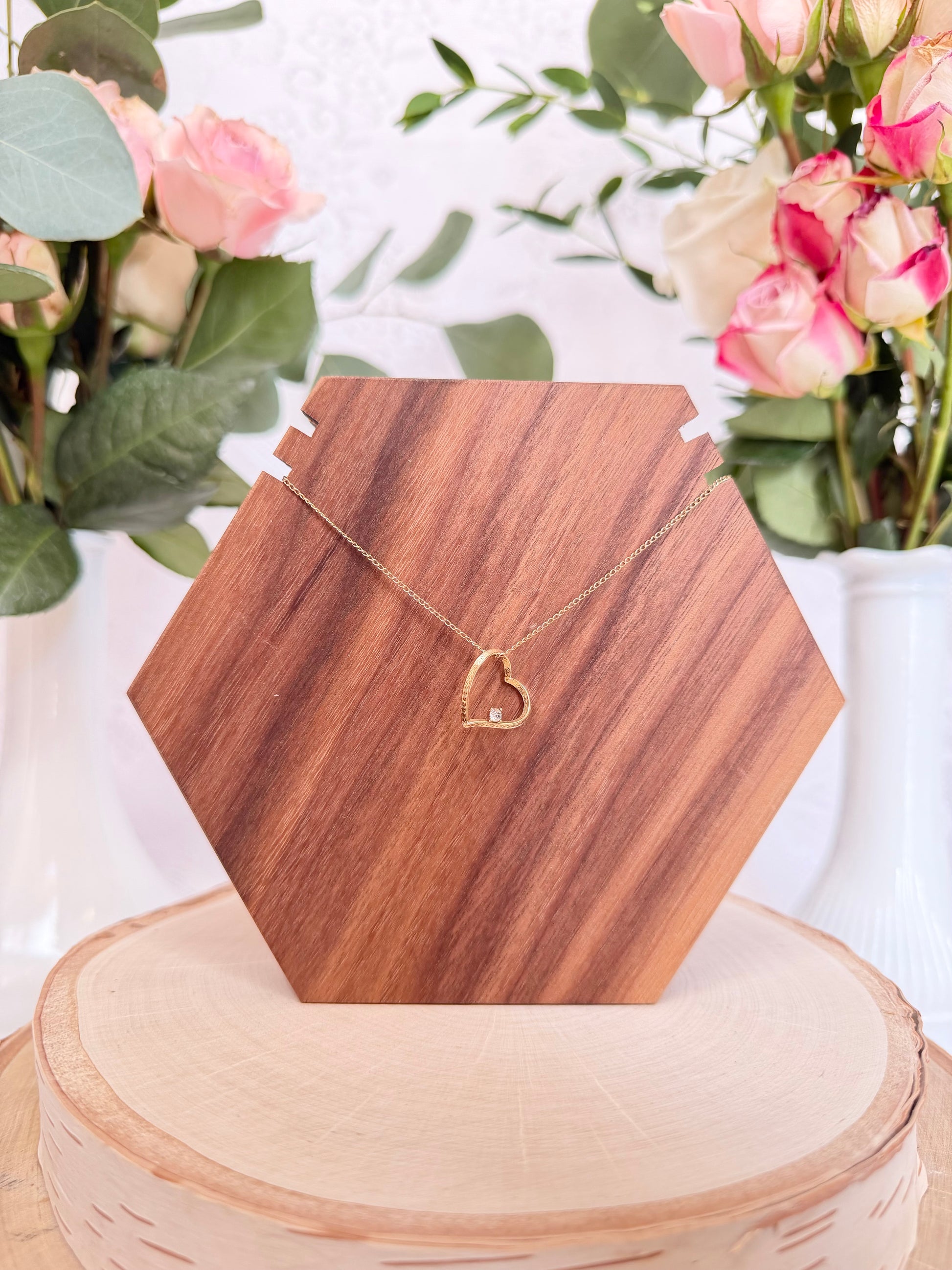 Heart shaped pendant (15.6mm wide, 15mm tall) with round cut solitaire diamond (2.4mm) on 17" 14kt yellow gold flat cable chain with spring ring clasp
