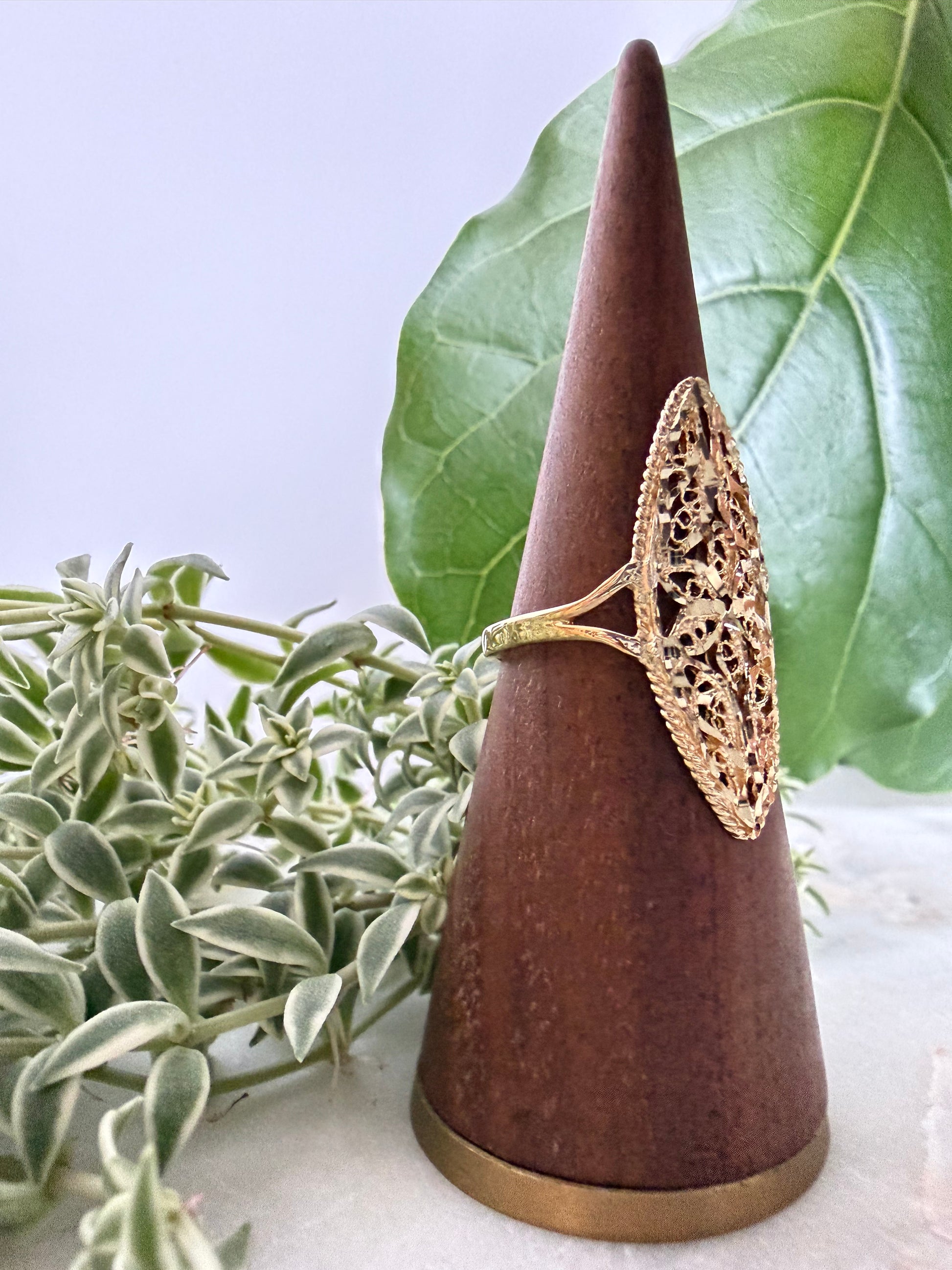 Diamond-cut 14kt yellow gold ring in a marquis shape with scroll detailing, ring size 7.5