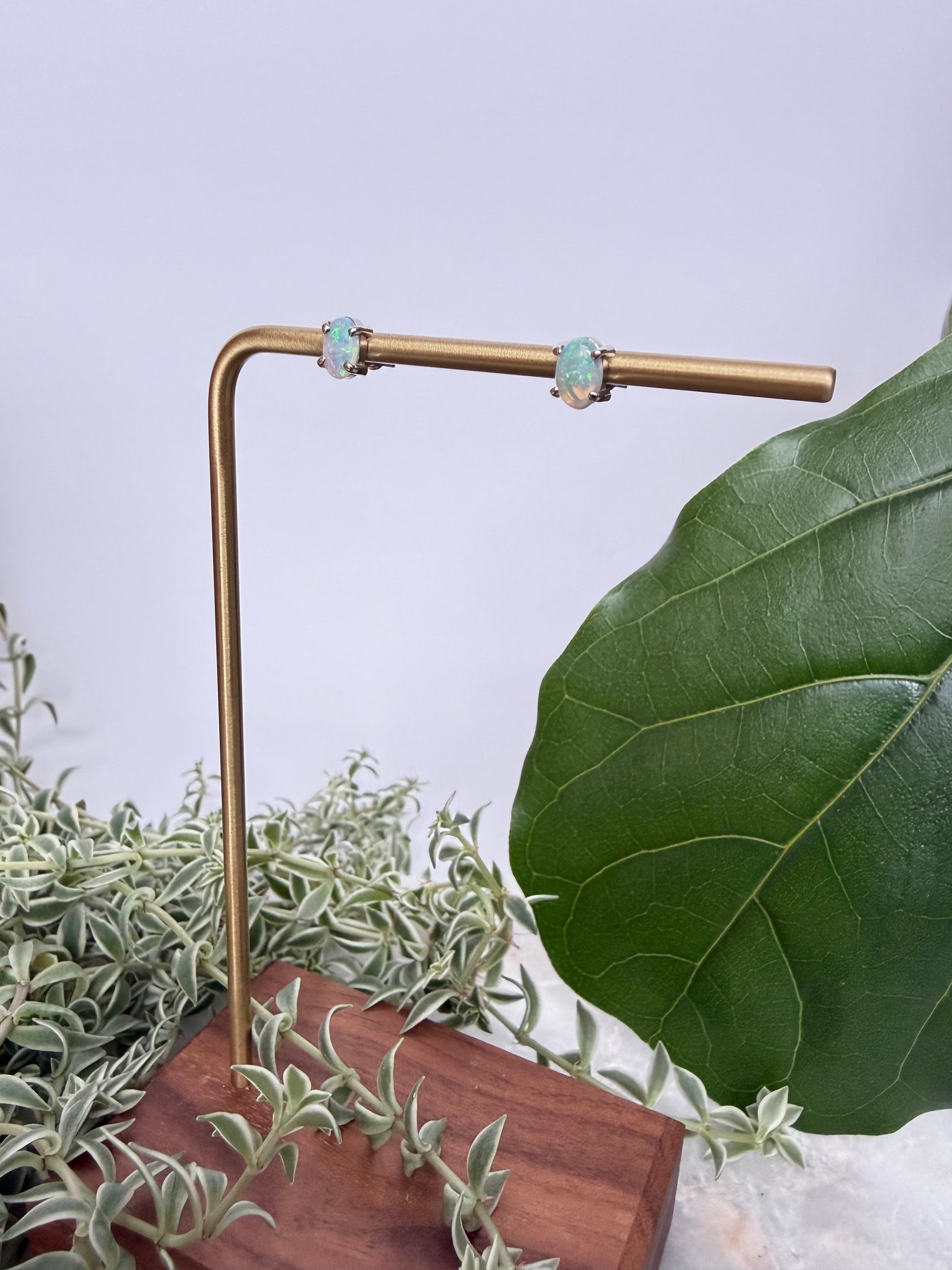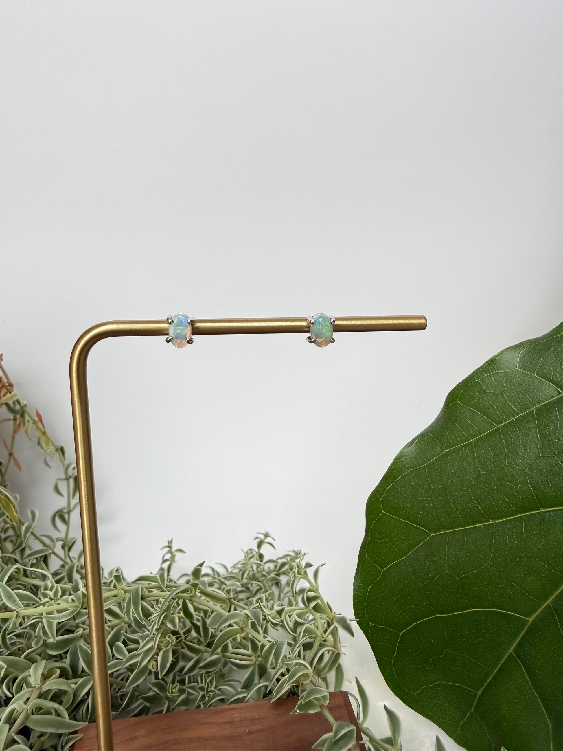 Oval shaped natural solid opal stud earrings (6mm in length) in 14kt white gold
