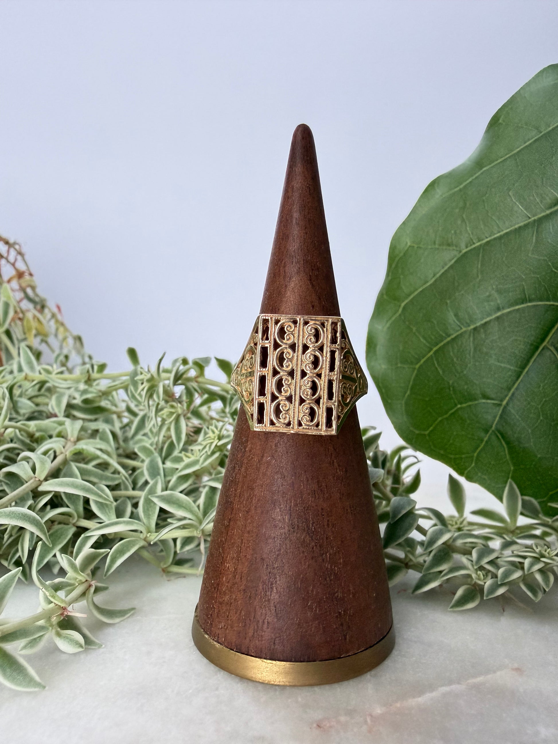 Rectangle shaped 14kt yellow gold ring with scroll detailing, ring size 6.5
