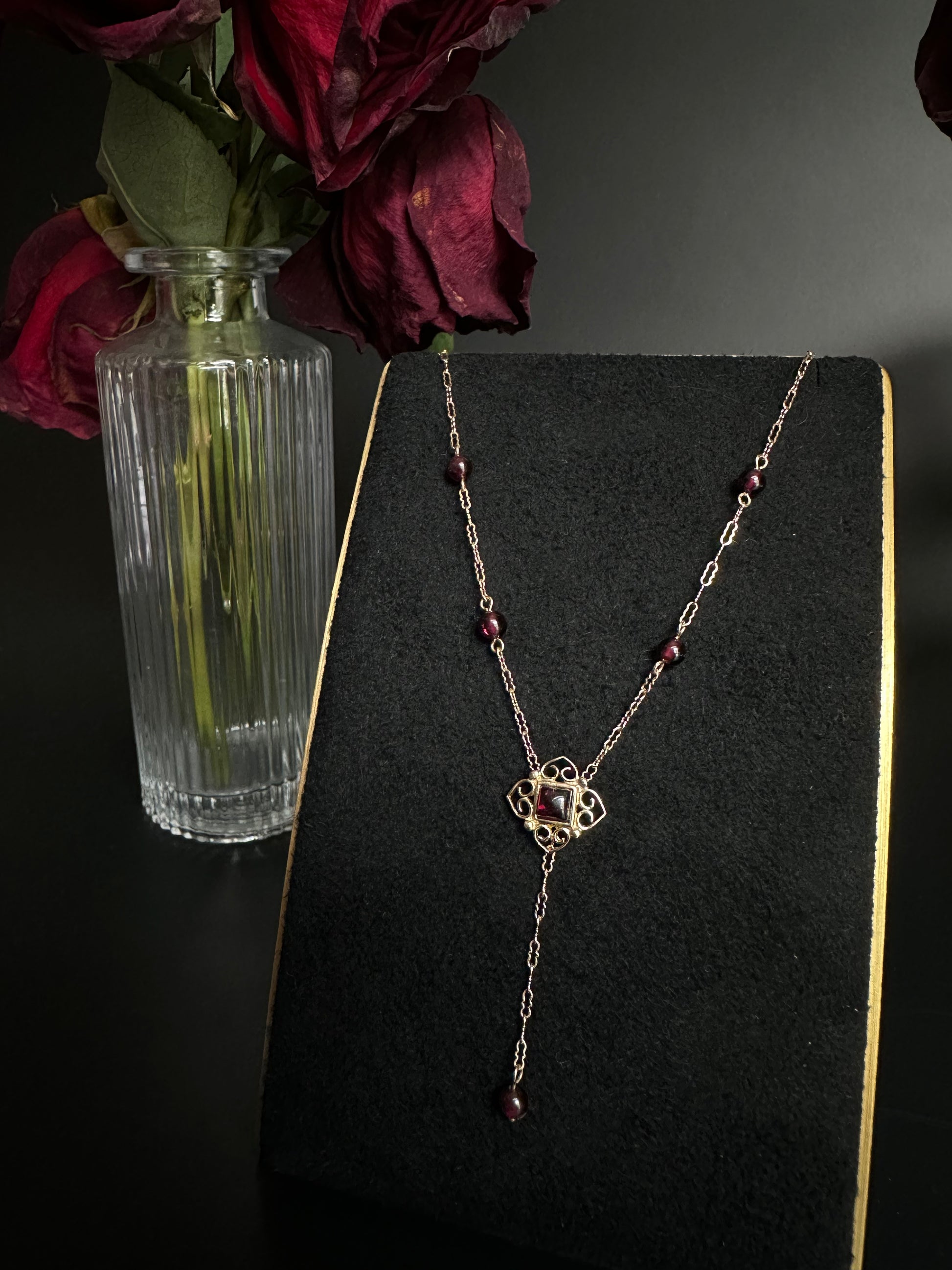 16" Vintage Red Garnet Lavalier Necklace 14K Sugarloaf cut with spring ring clasp