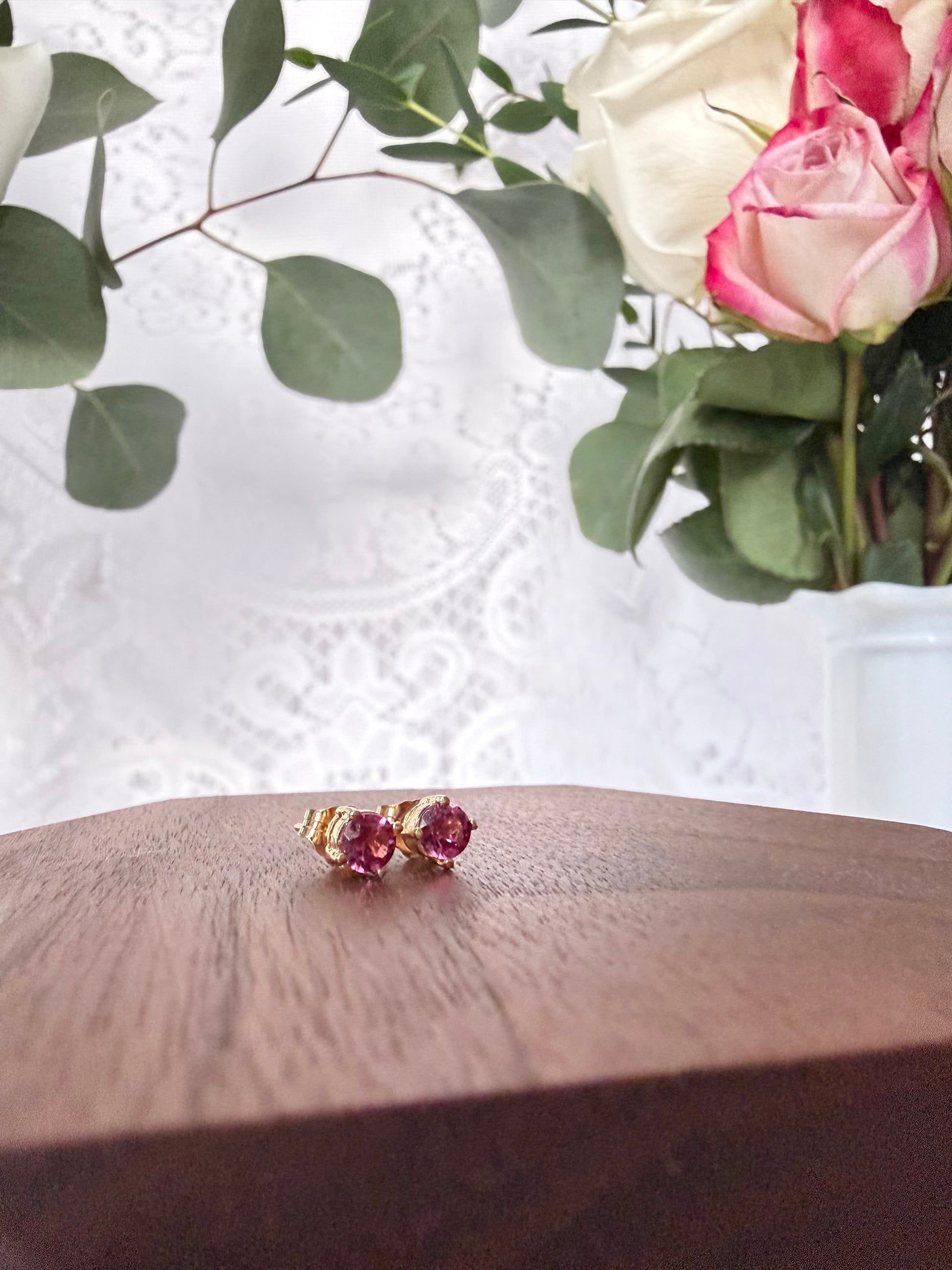 Round cut rhodolite garnet (3.9mm) stud earrings in 14kt yellow gold