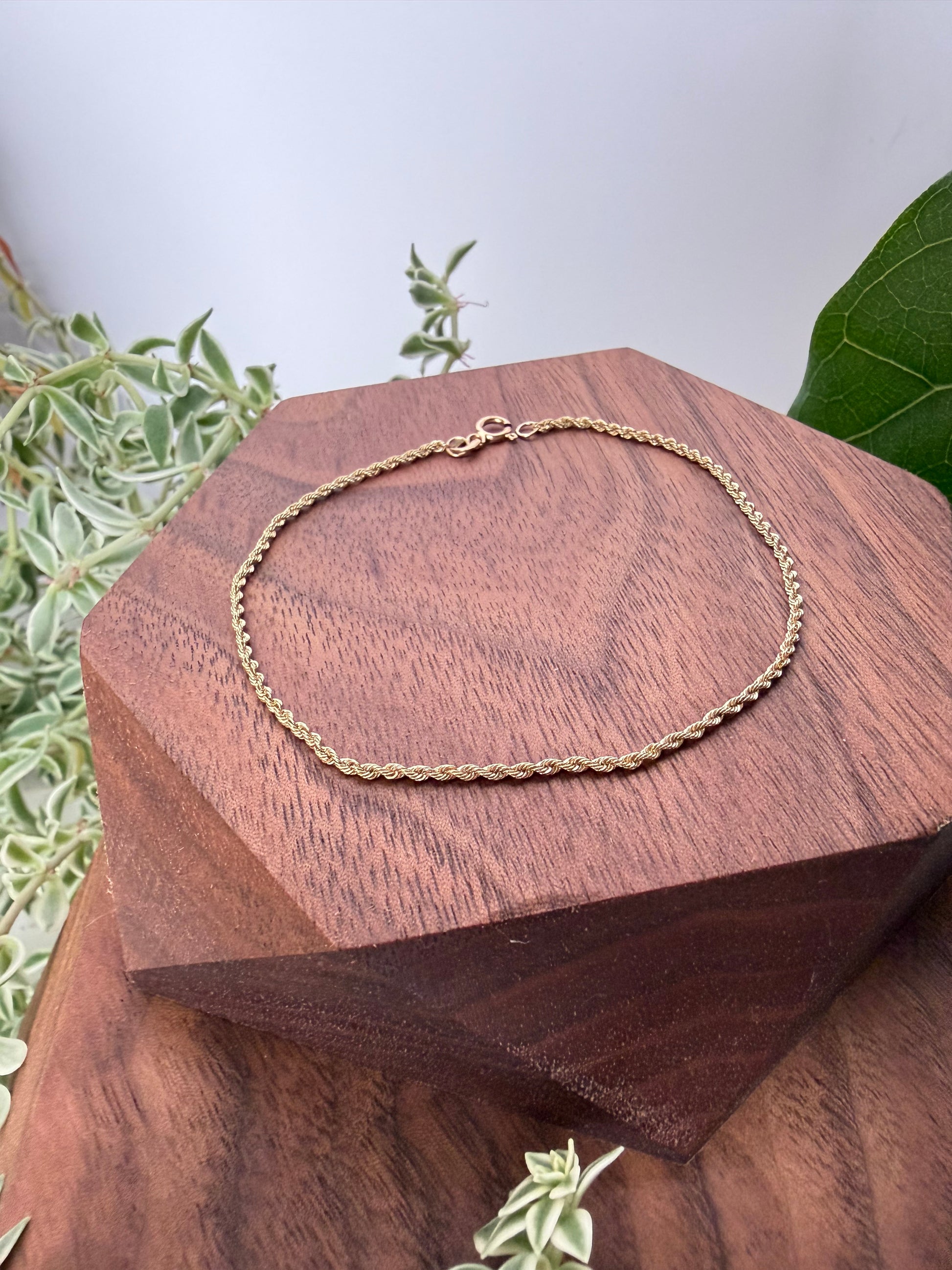 14kt yellow gold rope chain bracelet 1.3mm thick, 7" long, with spring ring clasp