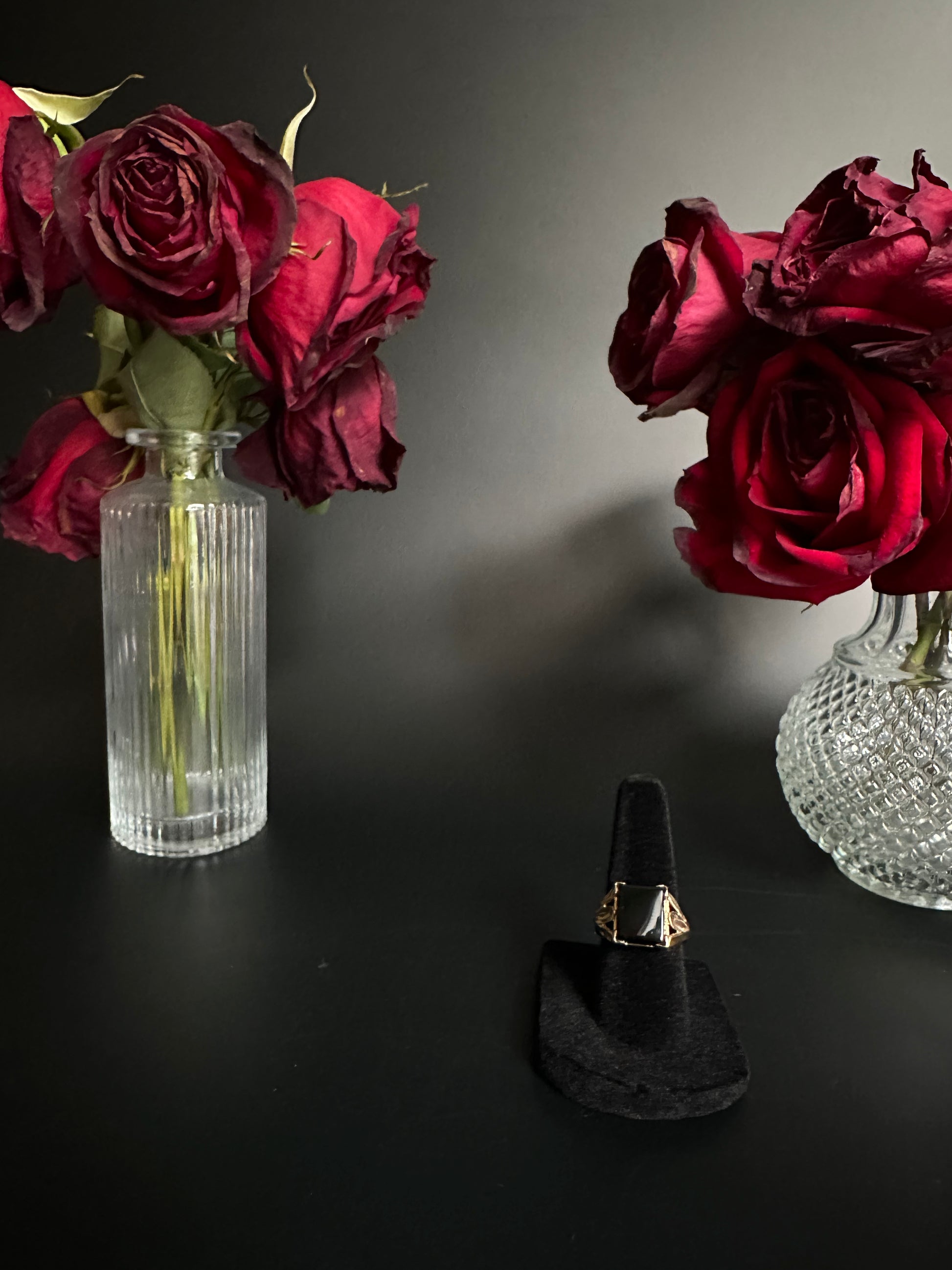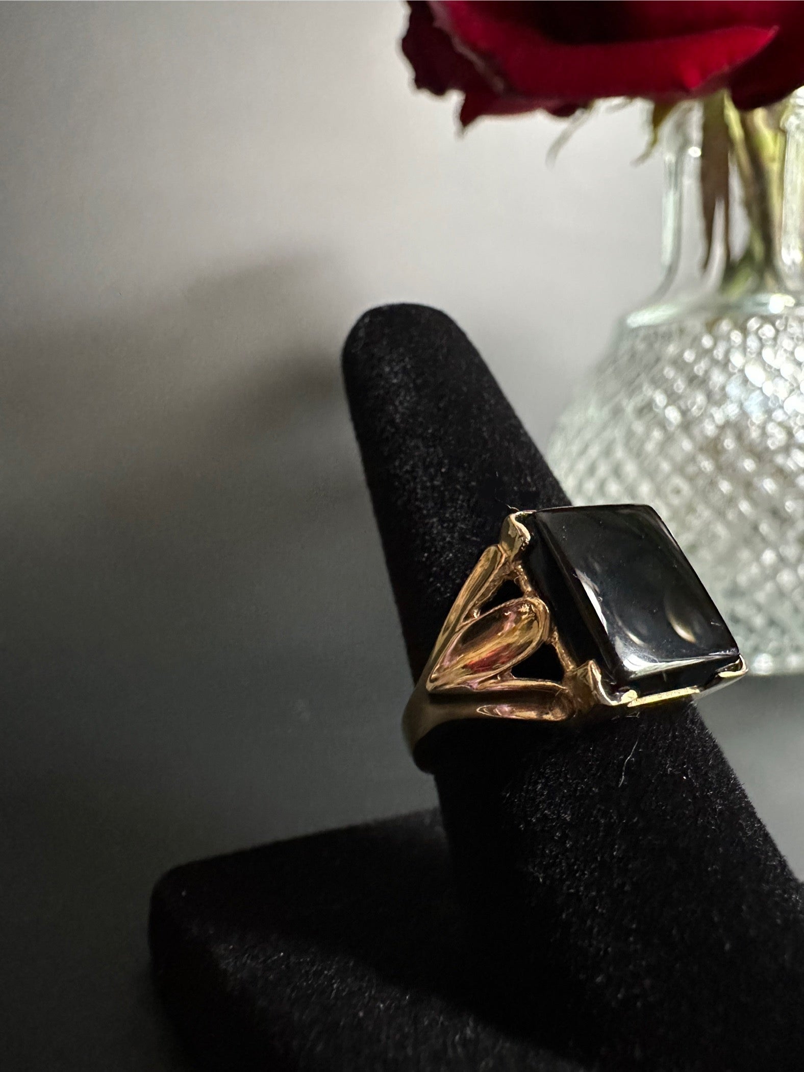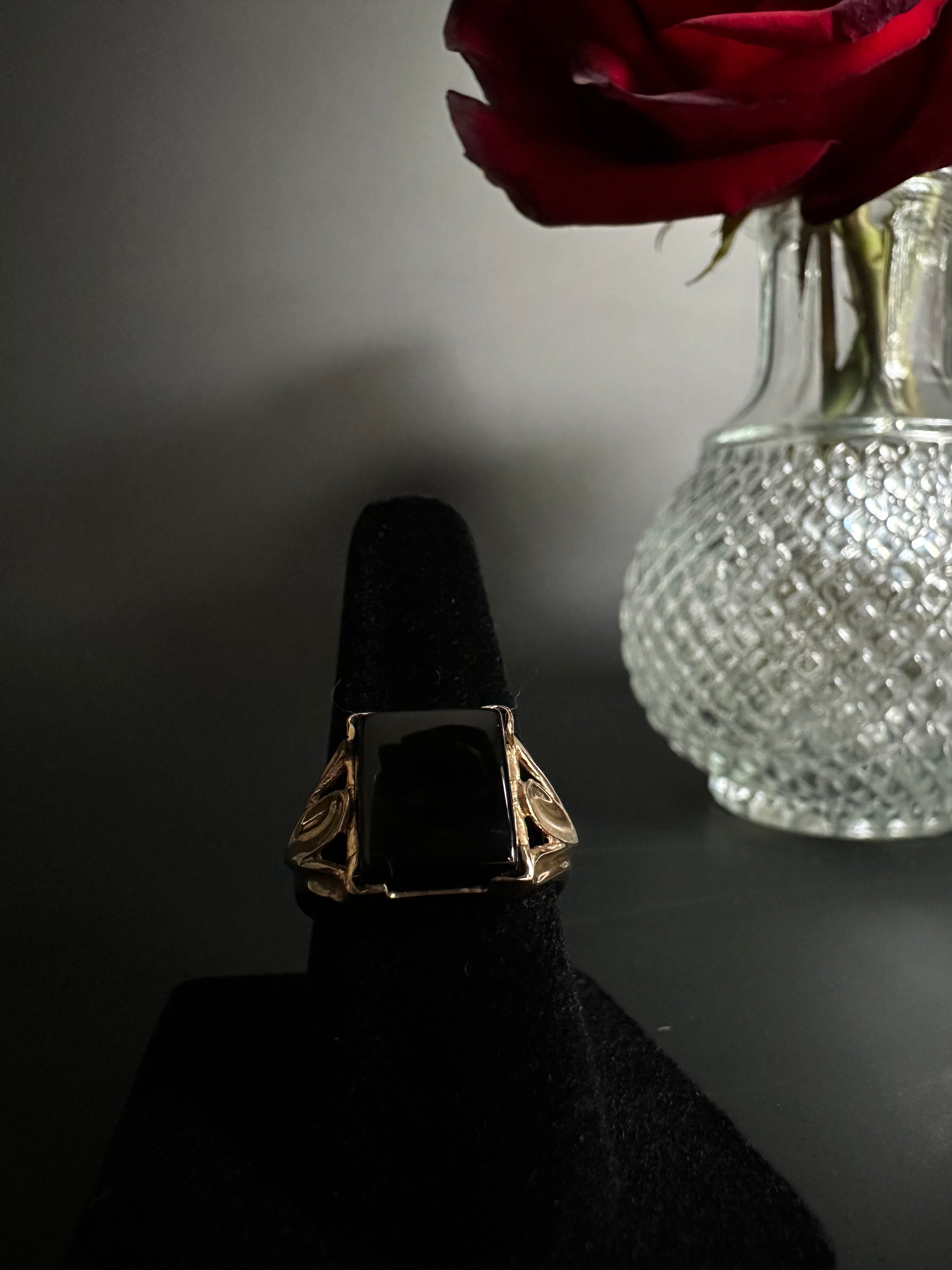 Square onyx ring in 14kt yellow gold with side detailing, onyx is 12mmx10mm, size 6